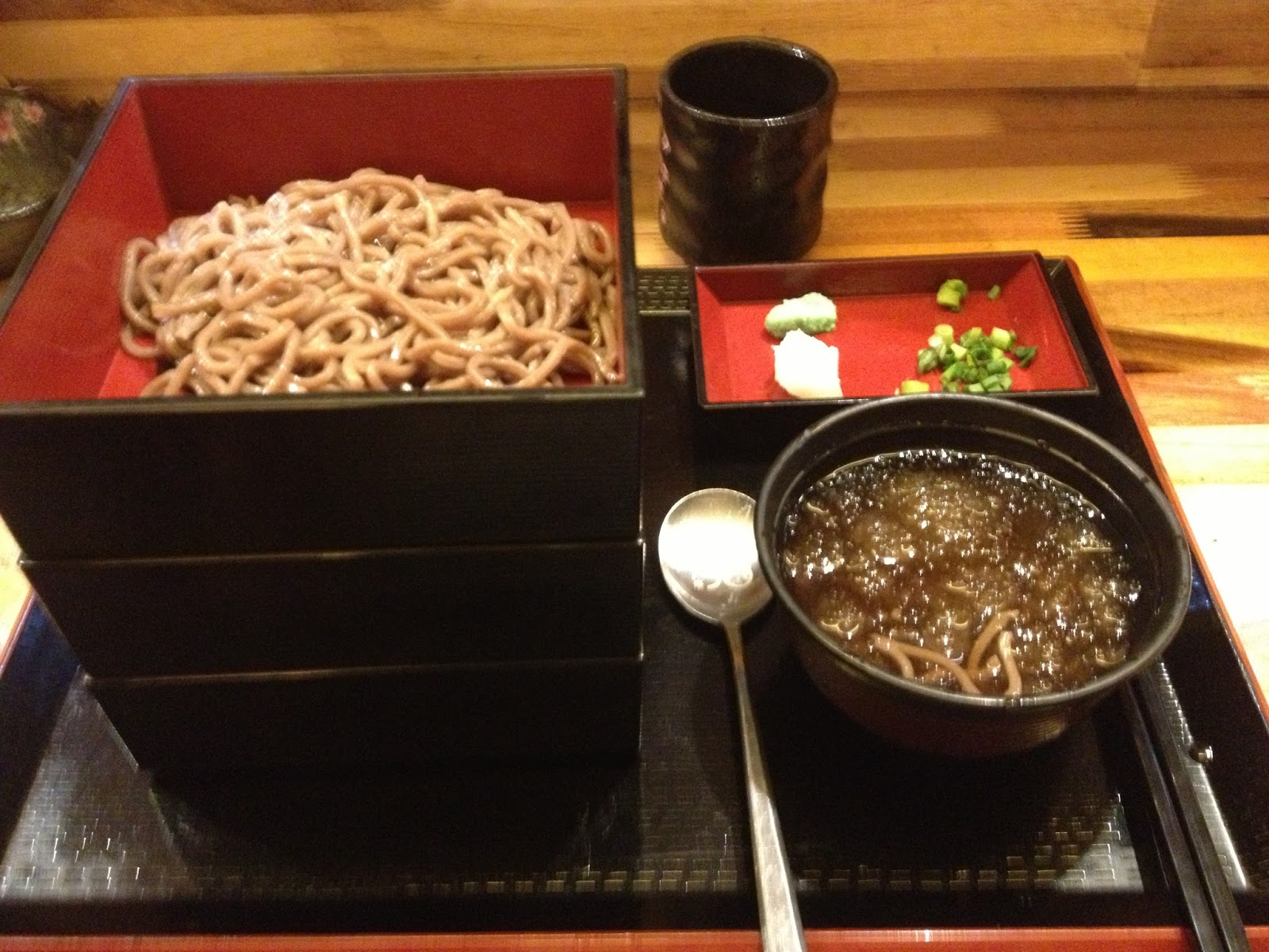 The buckwheat soba I got at Miyao. All three square trays have soba noodles in them. The bowl has a kind of soup with ice in it that you are supposed to dip the noodles in. You can add green onions, ginger, or wasabi from the little tray at the top to change the flabor of the soup.