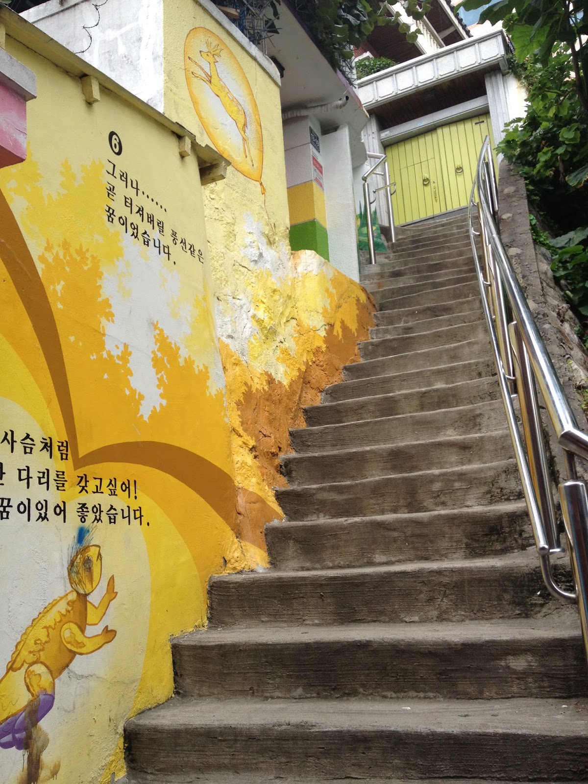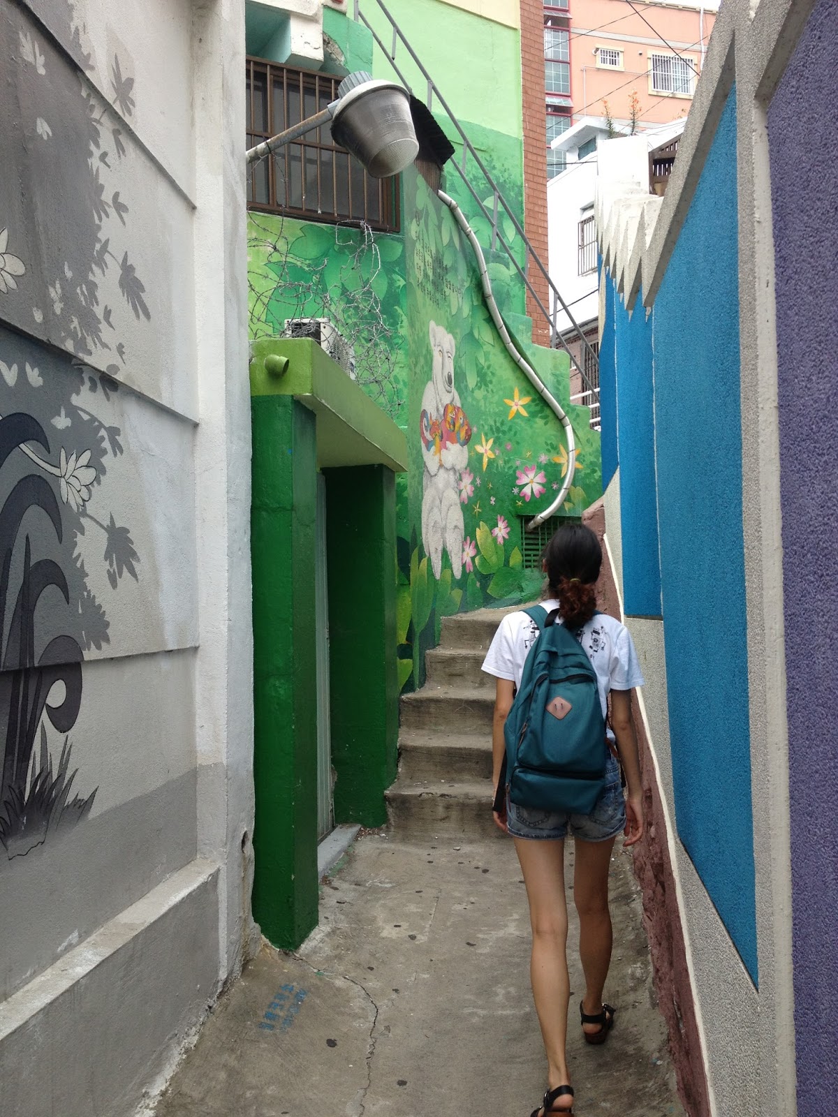 After we finished the patbingsu, we walked to this staircase with big paintings on all the walls that tells a story in Korean. It was cool but very steep and tiring! After we reached the top, there was actually nothing to do up there so we turned around and headed back down.