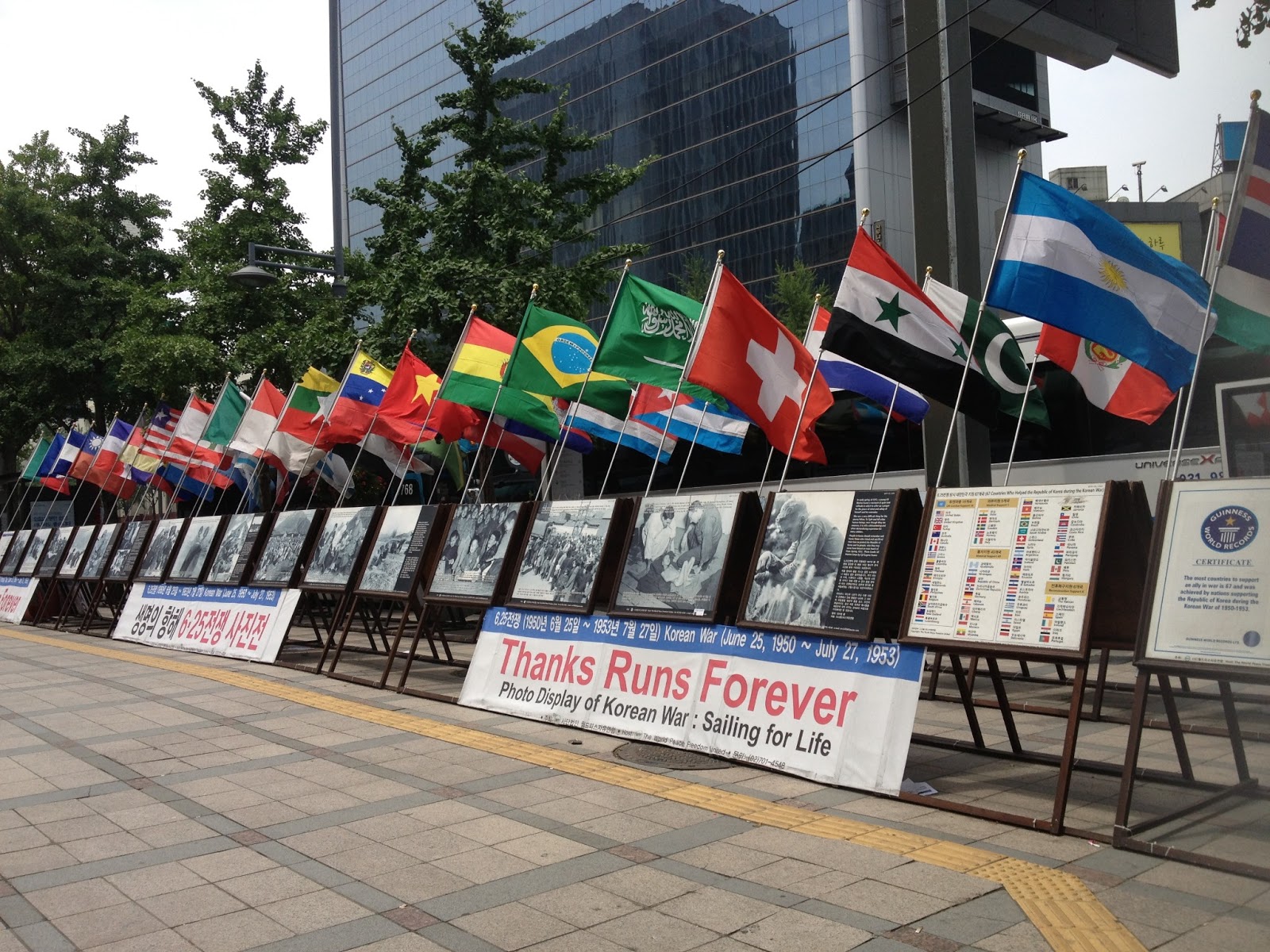 First, we headed toward the Insadong (인사동) district but quickly realized we were headed in the wrong direction! We turned around and went to Gwanghwamun Square (광화문) to get a picture of the US embassy and the Seoul city hall. We then headed east and saw Cheonggyecheon (청겨천) Stream, which is a beautiful park that runs through the area near Gwanghwamun Square. We put our feet in the water (it was ice cold!) and walked across a cool stone bridge.