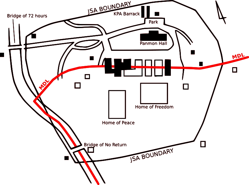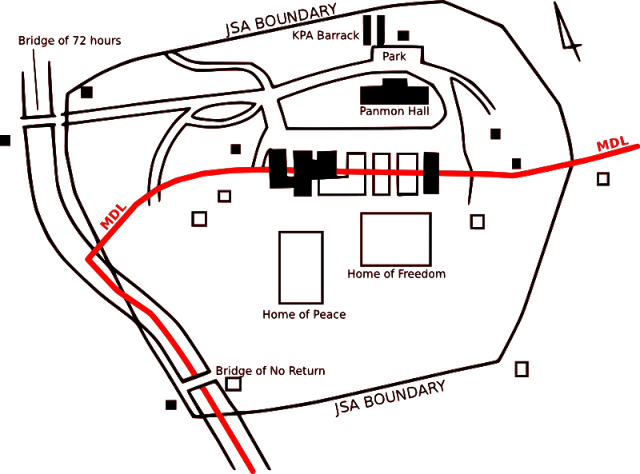 A map of the Joint Security Area. The top and left parts are North Korea, the bottom and right parts are South Korea. White buildings belong to the United Nations Command Korea and black buildings belong to the DPRK (North Korea).