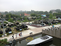 A bunch of vehicles, boats, planes, and helicopters outside the right-hand side of the museum.